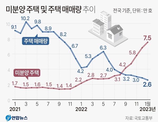 28일 국토교통부가 발표한 '1월 주택통계'에 따르면 지난달 전국 미분양 주택은 7만 5359호로 전달(6만 8148호)보다 10.6% 증가했다. 2012년 11월(7만 6319호) 이후 10년 2개월 만에 최대치다.