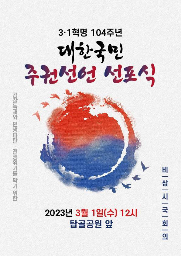 이들은 미리 배포한 주권선언문에서 “윤석열 정권 10개월 만에 대한민국이 자칫 치명적 위기에 부닥칠지 모른다는 불안감이 엄습해오고 있다”면서 “민족 자존과 국가 주권”을 실현하는 한 길에 대한국민 모두 힘차게 나아갈 것을 선언한다“고 밝혔다.