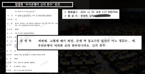 이날 정영학 회계사는 남욱 변호사에게 대형 은행들의 투자 참여를 이끌어낸 과정에 대해 언급했다. 정 회계사는 “은행 딱 잡고가면 일단은 어느 정도는…예. 우리은행이 여하튼 신의 한수라니까요. 신의 한수. (중략) 하나은행. 우리은행은 정말 다행인 거가, 이 담당이 우리 사이즈가 아니고 좀 큰 사이즈라서 고검장(*박영수)님 안계셨으면 아유 힘들어"라고 말했다. ‘우리은행 같은 경우 투자확약서를 받아내기 어려운 큰 은행인데 박영수 변호사 아니었으면 어려웠을 거’라는 얘기다. 박영수 변호사가 우리은행을 움직인 막후 실력자였음을 드러낸 말이다.