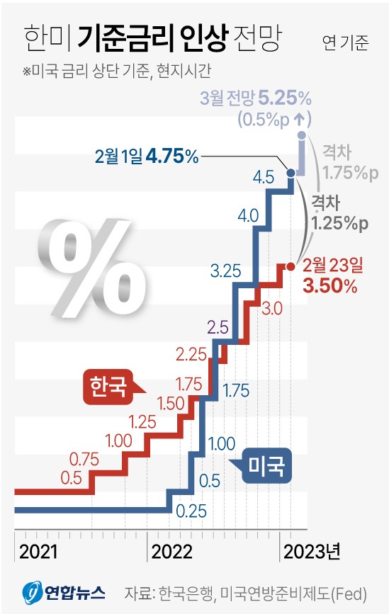 만약 연준이 3월 다시 빅스텝을 결정할 경우 미국의 기준금리는 현재 4.5∼4.75%에서 단번에 5.0∼5.25%로 올라가는데, 이는 지난해 12월 점도표(FOMC 위원들의 기준금리 전망을 보여주는 도표) 상의 최종금리 전망치 중간값(5.1%)과 거의 일치한다. 파월이 이를 모를 리 없기에 추가 긴축을 강력히 시사한 파월의 발언은 현재 연준이 생각하는 기준금리의 상단(height)과 기간(period)이 시장의 전망을 상회할 것임을 의미한다. 이는 시장참여자들이 그토록 갈망했던 연내 피벗(긴축에서 완화로의 통화정책의 방향전환)이 사실상 어려워졌음을 뜻한다. 파월의 발언 이후 미국 국채수익률은 뛰고, 증시는 가라앉았으며, 환율은 다시 불안해졌다.