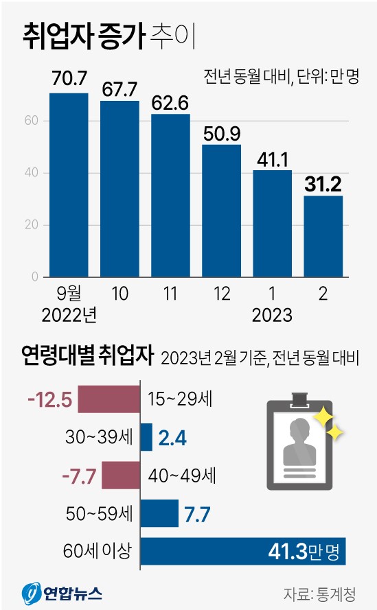 - 1월 취업자 증가 41만명뿐…그중 40만명이 60대 이상