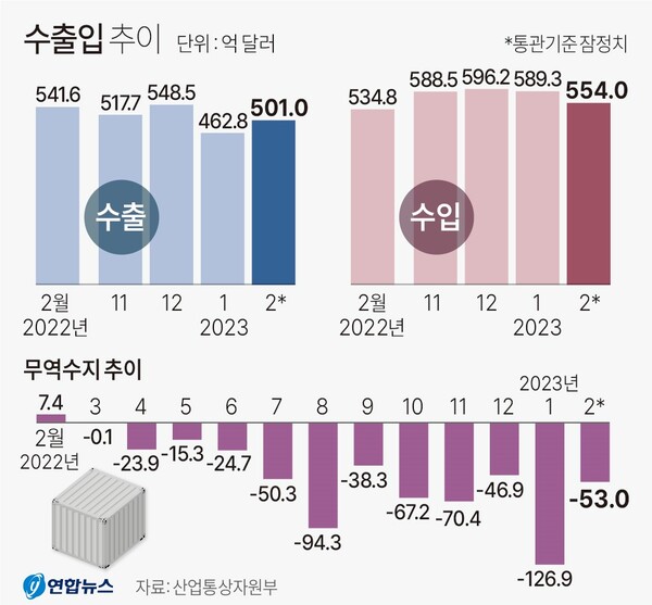 정부는 2월 경상수지는 무역적자가 1월(125억 달러)의 절반 이하로 줄었기 때문에 개선될 것으로 전망했다. 지난 1월 경상수지는 45억 달러 적자로 월간 기준 사상 최대 적자를 기록했다.