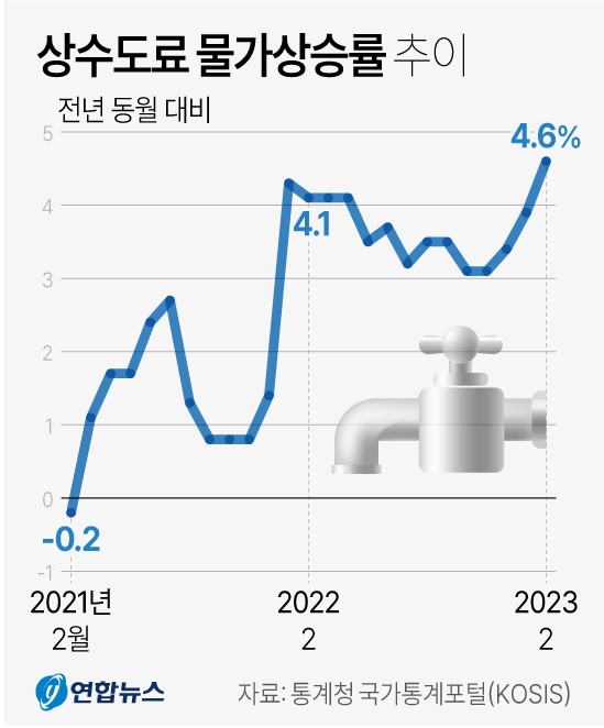 22일 통계청 국가통계포털(KOSIS)에 따르면 지난달 상수도료 물가 지수는 109.50(2020년=100)으로 1년 전보다 4.6% 상승했다. 지난 2006년 1월(6.1%) 이후 17년 1개월 만에 최대 상승 폭이다.
