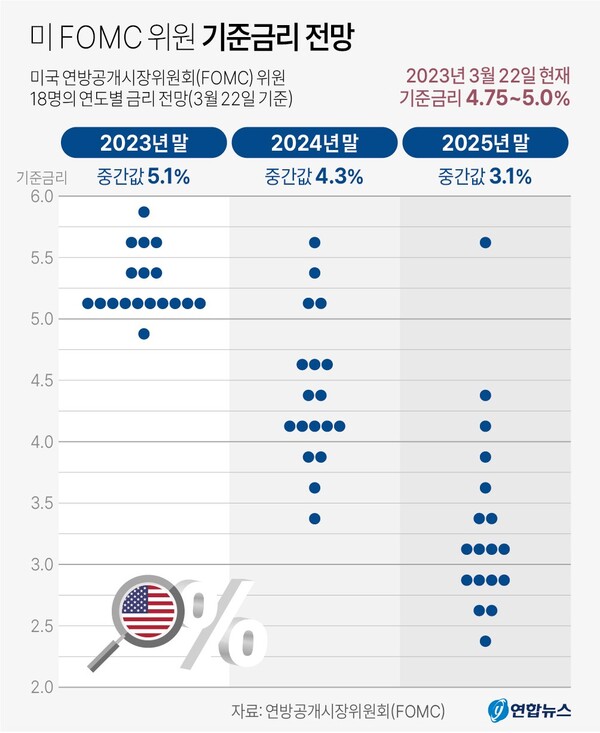 미국 기준금리는 애초 '빅스텝'(0.5%p) 전망이 우세했으나 실리콘밸리은행(SVB) 등의 파산 사태 이후 금융 불안이 계속되자 '베이비스텝'으로 돌아섰지만, 미 연준의 기준금리 인상 기조가 끝난 것은 아니다. 제롬 파월 연준 의장은 이날 연방공개시장위원회(FOMC) 회의 직후 "올해 중 금리인하를 전망하지 않는다"며 "우리가 금리를 더 올릴 필요가 있다면 그렇게 할 것"이라고 말했다.