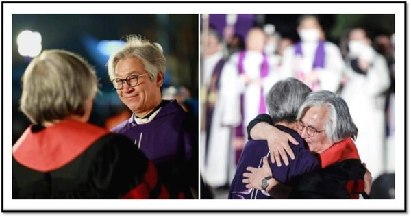 전주 풍남문 광장에서 있었던 시국미사와 촛불집회에서 천주교정의구현사제단의 김영식 대표 신부와 매주말 민주시민들의 촛불집회를 개최하고 있는 촛불행동의 김민웅 대표와의 포옹은 매우 감동적인 장면이었다.