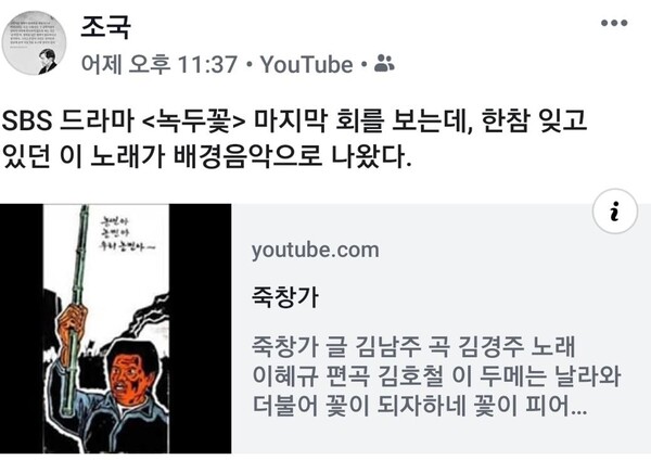 2019년 당시 조국 교수의 페이스북 게시물은 이런 상황과 정서를 반영한 것이었다. 그 게시물은 당시 인기를 얻고 있었던 드라마 <녹두꽃>의 마지막 장면에서 배경음악으로 깔린 김남주 시인의 시를 노래로 만든 것이었다. <녹두꽃>은 동학농민혁명을 다룬 드라마였는데, 아마도 요즘 같으면 종북이라며 압수수색 당할 내용일 수 있다(?). 드라마의 역사적 맥락 속에서 진정으로 잔인하고 야만적인 폭력은 일본군의 조총이었지 농민들의 죽창이 아니었다.