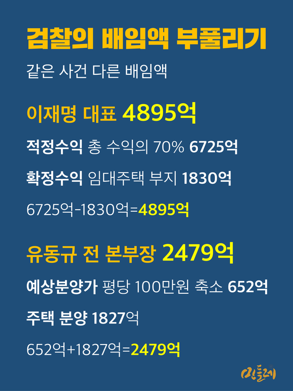 ‘대장동 배임’은 이미 유동규 전 성남도시개발공사 기획본부장을 피고인으로 이미 기소돼 있다. 이 사건에서의 배임액은 2479억 원이다. 그런데 이재명 대표를 상대로 기소한 사건의 배임 액수는 4895억원으로 껑충 뛴다. 검찰이 배임의 피해를 입었다고 주장하는 기관은 성남도시개발공사로 동일하다. 그런데 사업도 동일하고 피해 기관도 동일한데 그 액수는 두 배나 차이가 난다.