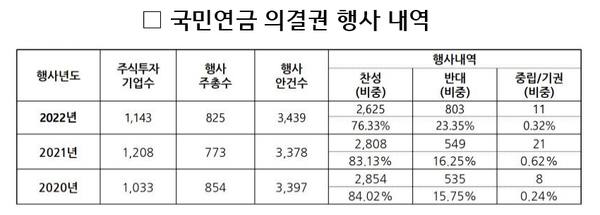 이 가운데 찬성 의결권은 2625건(76.33%), 반대는 803건(23.35%), 중립 또는 기권은 11건(0.32%)이었다. 반대 의결권 행사 비율은 2021년 16.25%보다 7.1%p 높아졌다. 2021년에는 총 3378개의 안건 중 549건에 반대했다.