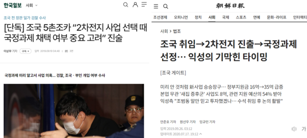 대표적인 언론 보도 두 개부터 살펴보자. 먼저 아래는 2019년 9월 19일 한국일보 이상무 기자의 단독 보도 내용이다. ☞ [단독] 조국 5촌조카 “2차전지 사업 선택 때 국정과제 채택 여부 중요 고려” 진술
