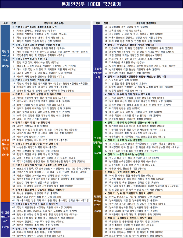 “문재인정부 100대 국정과제”의 구체적인 사업 내용은 역시 “대한민국 정책브리핑” 사이트에 공개되어 있는 ”문재인정부 4년 100대 국정과제 추진실적” 자료에서 확인 가능하다. 이 자료는 260페이지에 이르는 세부적인 추진 과정 설명 자료로서, 100대 국정과제의 세세한 내용과 구체적인 추진 실적들이 열거되어 있다.
