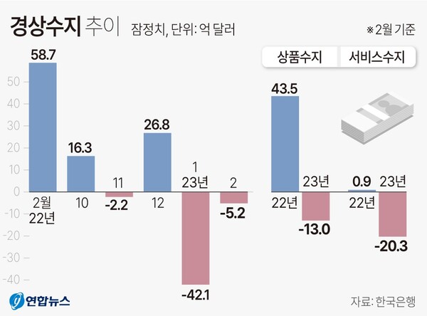 경상수지가 2개월 연속 적자를 기록한 것은 2011년 1월(-22억 9000만 달러)과 2월(-28억 8000만 달러) 이후 11년 만이다.