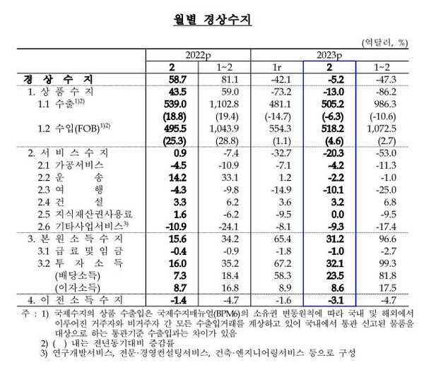 7일 한국은행이 내놓은 '2월 국제수지(잠정)'에 따르면 경상수지는 지난 1월(-42억 1000만 달러)에 이어 2월(-5억 2000만 달러)에도 적자를 기록했다. 전달에 비해 경상수지의 적자 폭은 줄었지만 상품수지와 서비스수지가 모두 적자다. 이에 따라 2월까지 누적 경상수지는 47억 3000만 달러 적자를 나타냈다.