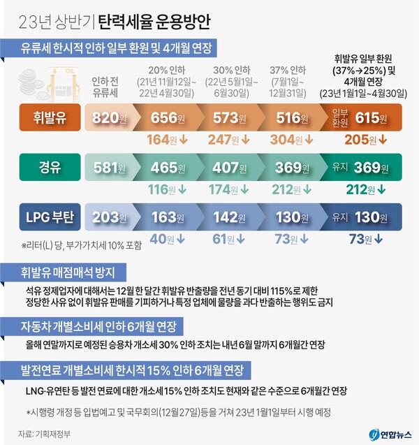유류세 인하는 올해로 3년째 시행되고 있으며, 유류세 인하에 따른 세금(교통·에너지·환경세) 감소분은 작년 한 해만 5조 5000억 원에 달했다.