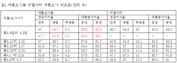 리얼미터 역시 3월 4주차(24일)에는 민주당 45.4% 대 국힘 37.9%로 차이가 벌어진 뒤 3월 5주차(31일)에는 47.1% 대 37.1%로 10%포인트 차이를 보인 것으로 집계됐다. 이러한 현상은 4월 1주차(7일) 조사에서도 민주 45.9%, 국힘 37%로 오차범위를 한참 벗어난 것으로 조사됐다. (표 1 참조)