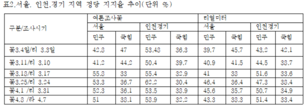 꽃 4주차 조사에서는 민주당이 55%(국힘 36.7%)로 국힘과의 격차를 무려 18.3%포인트나 벌렸다. 4월 1주차(1일)에는 51.6%를 기록, 국힘 36.4%에 비해 15.2%포인트 높게 조사됐다. 4월 2주차(8일)에도 민주당 51.6%,국힘 34.6%로 지지율 차이가 17.6% 포인트로 벌어졌다.