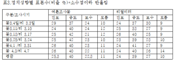 표3 정치성향별 분석표에서는 특별한 점이 없다. 꽃 조사에서는 평균적으로 진보성향 표본비율이 보수성향보다 3%포인트, 리얼미터에서는 보수성향이 진보성향보다 3%포인트 높은 것으로 조사됐다. 꽃은 진보성향이, 리얼미터는 보수성향이 더 많이 응답에 응하는 것을 알 수 있다. 회차(리얼미터 3월 첫주 진보 24%, 보수 30%)에 따라 큰 차이를 보이기도 하지만 전체적으로는 나쁘지 않은 표본 구성이라고 할 수 있다. 표본 구성은 CATI 조사에서도 꽃은 진보성향, 갤럽은 보수성향 표본이 더 많은 구성비를 보인다.