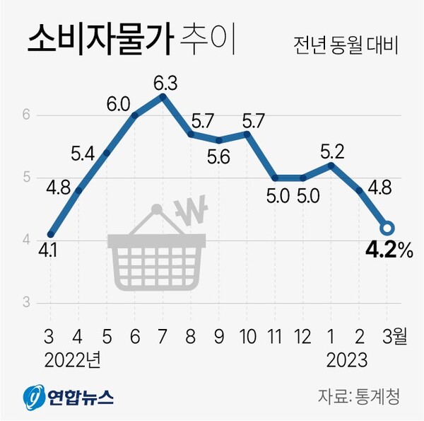 통계청에 따르면 3월 소비자물가지수(110.56)는 작년 같은 달보다 4.2% 올랐다. 상승률이 2월(4.8%)보다 0.6%p 떨어졌고, 작년 3월(4.1%) 이후 1년 만에 가장 낮았다.