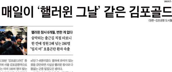 13일자 조선일보는 1면 머릿기사로 "숨이 막혀요"…매일이 '핼러윈 그날' 같은 김포골드라인“이라는 기사를 실었다. 전전날인 11일에 김포도시철도 김포공항역에서 10대 여고생과 30대 직장인이 호흡곤란으로 의식을 잃고 쓰러진 일을 계기로 이 지하철 노선의 혼잡 문제를 다루고 있다. 지하철의 혼잡과 과밀을 이태원 참사와 연결해 마치 이태원 참사의 원인이 인파와 과밀에 있었던 것처럼 논지를 전개한다.