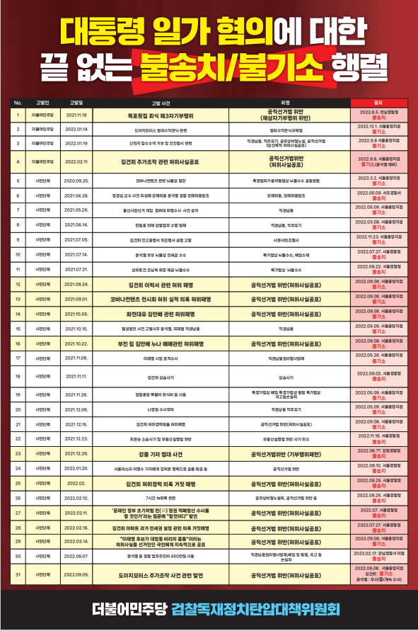 민주당 검찰독재정치탄압대책위원회에 따르면, 지난 대선을 전후해 시민단체와 민주당이 윤 대통령 일가 혐의에 관해 고발한 사건 90여 건 중 지금까지 31건(약 30%)이 경찰과 검찰에 의해 불송치·불기소 처리됐다. 선거법 위반 혐의 고발은 18건 중 12건(약 67%)이 불송치·불기소로 종료됐다. 아직까지 재판에 넘겨진 사례는 전무하다. 공직선거법 위반 혐의는 정권의 정당성, 나아가 존립 여부에 직접적인 영향을 미치기 때문에 검경이 더욱 예민하게 접근하는 것으로 해석된다.