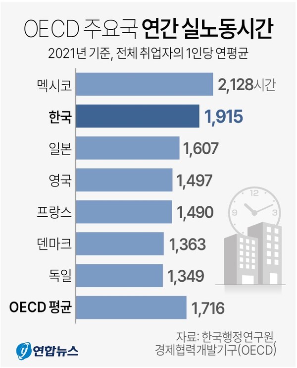 한국행정연구원의 보고서에 따르면 국내 임금노동자의 연간 노동시간은 2021년 1915시간으로 경제협력개발기구(OECD) 평균인 1716시간보다 199시간이나 길다. 하루 8시간 노동 기준으로 연간 25일이나 더 일하는 셈이다. 연간 1349시간 일하는 독일과 비교하면 1년에 566시간(70일) 더 일한다. 이는 OECD 38개 회원국 중 5위로 우리보다 순위가 높은 나라는 멕시코(2128시간), 코스타리카(2073시간), 콜롬비아(1964시간), 칠레(1916시간) 등 4개국뿐이다.