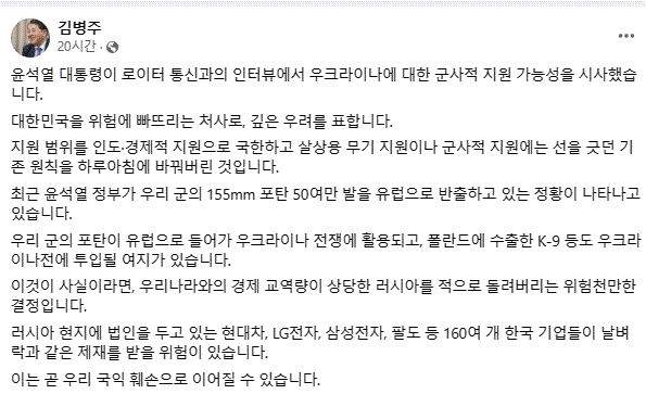 이어 “제국주의 국가들의 이해관계 때문에 지금 이 순간에도 우크라이나 땅에서 수많은 사람들이 속절없이 희생되고 확전의 위험도 커지고 있다”며 “따라서 한국의 우크라이나 군사 지원은 이런 비극이 더 연장되고 위험이 커지는 데 일조하는 선택이 될 것”이라는 경고도 했다. “그 위험은 우크라이나뿐 아니라 우리가 사는 한반도도 직간접적으로 해당된다”는 말도 덧붙였다.