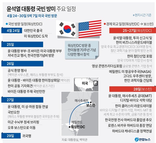 윤 대통령의 공식 일정은 △ 정상회담과 공동 기자회견, 국빈 만찬(26일) △ 상·하원 합동 의회 연설(27일) △ 매사추세츠 공대(MIT) 디지털 바이오 분야 석학 대담. 한미 클러스터 라운드 테이블 참석, 하버드대 케네디스쿨 정책연설(28일) 등으로 되어 있다.