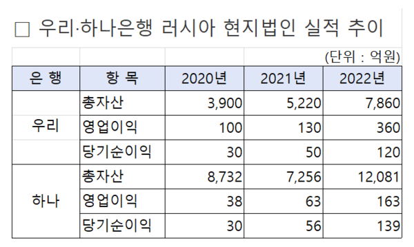 하나은행 러시아법인도 지난해 영업이익 163억 원을 기록해 전년(63억 원) 대비 158% 늘어났고, 당기순이익도 139억 원으로 2021년(56억 원)에 비해 148% 증가했다.