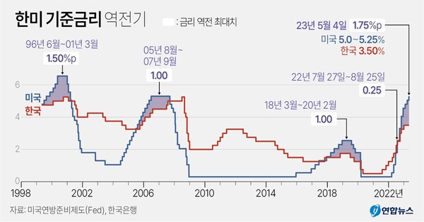한국과 미국의 기준금리 차이가 역사상 최대로 벌어졌다. 이에 따라 원/달러 환율과 외국인 자금 이탈에 대한 우려가 한층 높아졌다.