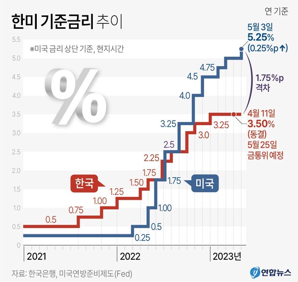 미국 연방준비제도(Fed·연준)는 3일(현지시간) 연방공개시장위원회(FOMC) 정례회의에서 기준금리 목표 범위를 4.75∼5.00%에서 5.00∼5.25%로 0.25%포인트 올렸다. 시장이 예상한 수준인 베이비스텝(기준금리 0.25%포인트 인상)이긴 하지만, 한미간 기준금리 격차가 역대 최대 수준인 1.75%포인트까지 벌어졌다.