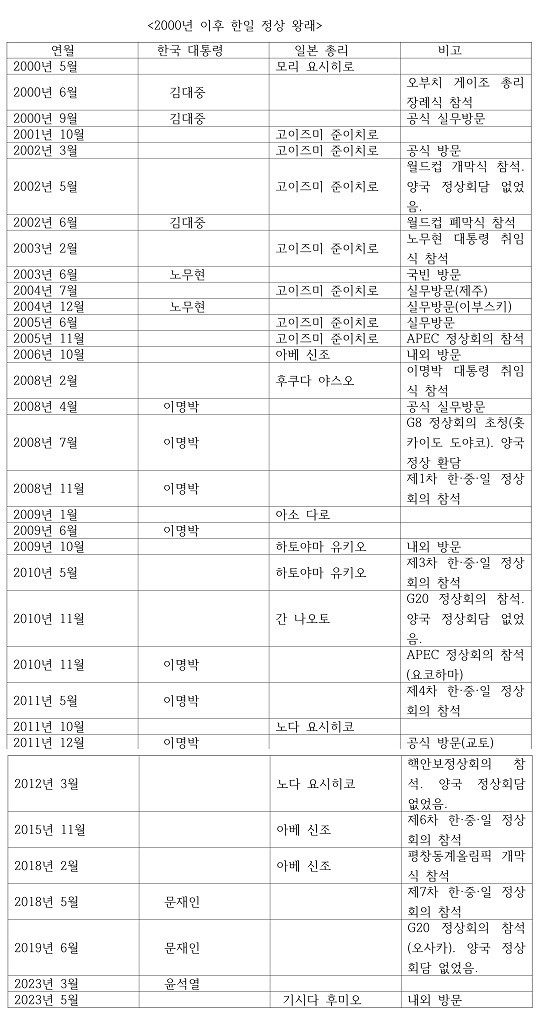 두 정상이 사전에 입이라도 맞춘 듯 강조한 또 하나의 사안은, 한·일, 한·미, 미·일, 한·미·일 안보 협력의 강화입니다. 두 정상은 북한의 핵과 미사일 개발, 인도·태평양 지역의 전략적 중요성, 지역 안보 환경 변화, 프놈펜 3국 공동성명을 주거니 받거니 거론하며, 안보 협력의 필요성을 되뇌었습니다. 4월 26일의 한·미 정상회담과 5월 히로시마 주요 7개국(G7) 정상회의(19~21일) 사이에 급히 한·일 정상회담을 징검다리로 끼워 넣은 것이, 중국과 북한을 겨냥한 한·미·일 군사 협력의 강화로 원활하게 가기 위한 사전포석이라고 봐도 무방할 것입니다.