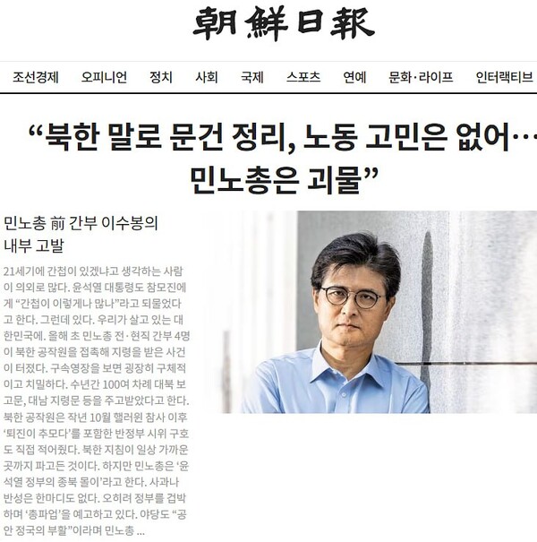 이수봉 씨가 안철수당으로 가더니, 민생당을 거쳐서 지난 지방선거에서는 서울시장 후보로 출마해 다른 군소 후보들과 TV토론을 하는 장면을 애잔한 마음으로 지켜본 과거 동료들은 이제 <조선일보>에 등장해 민주노총을 욕하는 이수봉 씨를 보면서 여러 복잡한 감정이 들었을 것이다. 인터뷰 내용은 딱 <조선일보>가 듣고 싶은 이야기들만 고른 것 같았다.
