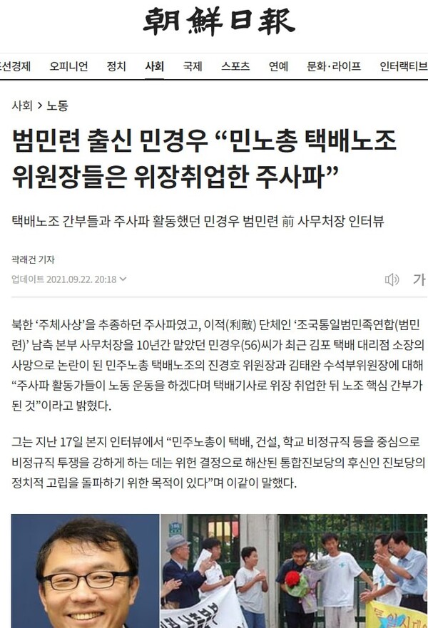 그런 말을 국정원, 검찰, 족벌언론 기자가 하는 것보다 진보단체나 민주노총의 간부였던 사람이 하는 것이 훨씬 더 잘 먹힌다. 그것을 잘 보여주는 사례가 민경우 씨다. 민경우 씨는 <조선일보> 인터뷰에서 문재인 정부를 "유사(類似) 주사파"라고, '한국진보연대'는 "주사파가 만든 통일 전선 조직"이라고 낙인찍었고, "주사파 활동가들이 노동운동을 하겠다며 택배 기사로 위장 취업한 뒤 노조 핵심 간부가 됐다"고 민주노총을 '고발'했다.