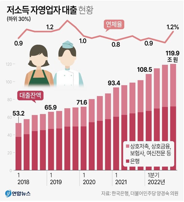문제는 코로나19 발생 이후 저소득 자영업자들의 대출에 대해 3년 이상 원금 및 이자 상환을 미뤄주는 등 지원에도 불구하고 이들의 연체율이 급속하게 올라갔다는 점이다.