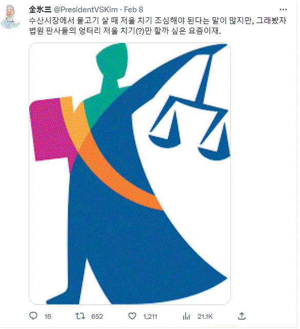 “수산시장에서 물고기 살 때 저울치기 조심해야 된다는 말이 많지만, 그래봤자 법원 판사들의 엉터리 저울치기(?)만 할까 싶은 요즘이재.”
