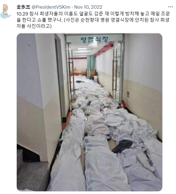 “10·29 참사 희생자들의 이름도 얼굴도 감춘 재 이렇게 방치해 놓고 매일 조문을 한다고 쇼를 했구나. (사진은 순천향대 병원 영결식장에 안치된 참사 희생자들 사진이라고)”