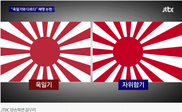 그즈음 일본 해상자위대가 창설 70주년을 기념해 국제관함식을 개최, 한국을 초청한다는 소식이 들려왔다. 한국 해군은 초청에 응했다. 11월 6일, 한국 해군은 욱일기와 모양이 같은 해상자위대기를 단 일본의 대형 호위함에 경례해야 했다. 이종섭 국방장관은 “(자위함기는) 약간 기울어져 있다”며 “형상은 비슷하지만 자세하게 놓고 보면 차이가 있다”는 ‘웃픈 해명’을 내놨다.