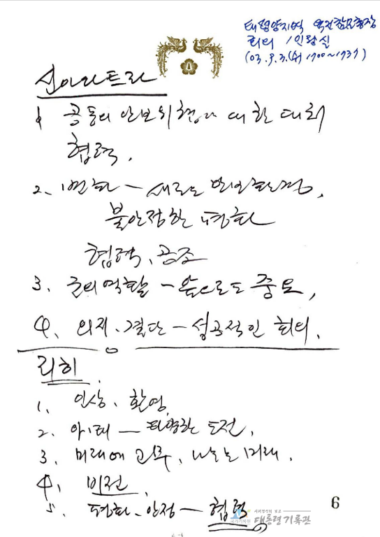 2003년 9월 노무현 대통령이 태평양지역 육군 참모총장회의(PACC) 참가자 21명을 접견한 자리에서 남긴 2쪽짜리 메모입니다. ‘공동의 안보위협에 대한 대처 협력’‘변화-새로운 안보환경, 불안정한 평화’와 함께 ‘군의 역할-앞으로도 중요’라고 적혀있습니다. ‘비전, 평화·안정- 협력’ 등 노 대통령의 외교·안보 키워드가 메모되어 있습니다.
