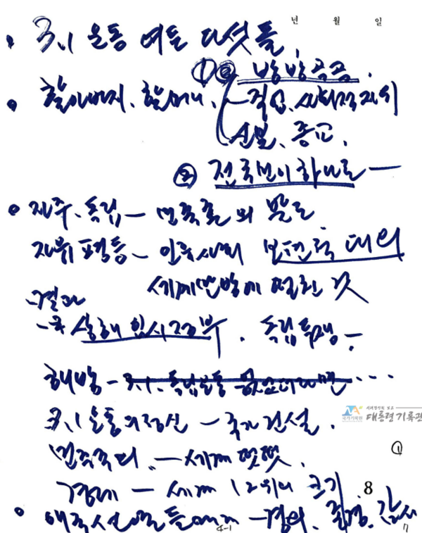 정상회담이나 회의, 기념식 현장에서 노무현 대통령은 각국 정상이나 참석자들에게 전할 생각의 열쇳말, 나눈 대화 내용을 꼼꼼히 메모해 두었습니다. 연설비서관이 적어준 연설문·회의발언을 그대로 읽지 않고 자신의 생각을 정리해 직접 작성한 메모를 바탕으로 발언하고 대화를 나눴습니다. 특히 2004년 제85주년 삼일절 연설문 친필 메모는 현장에서 연설비서관이 써준 연설문 대신 사용된 즉석 연설문 초안이었습니다. 그때그때 해당 분야·주제에 관한 노 대통령의 깊은 지식과 자신감을 느끼게 하는 대목입니다.
