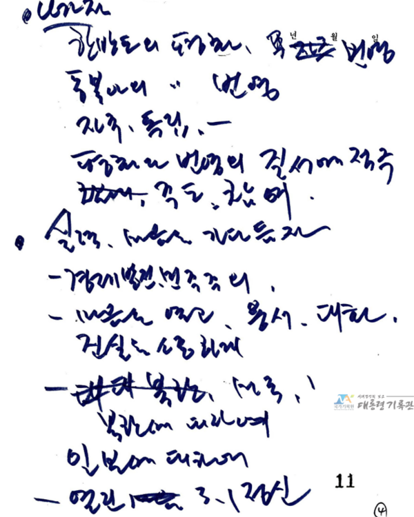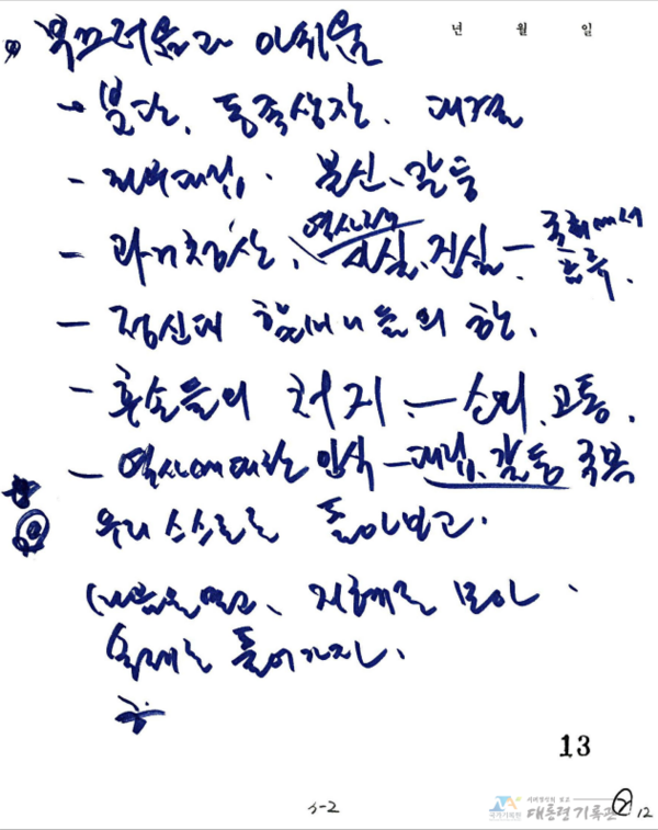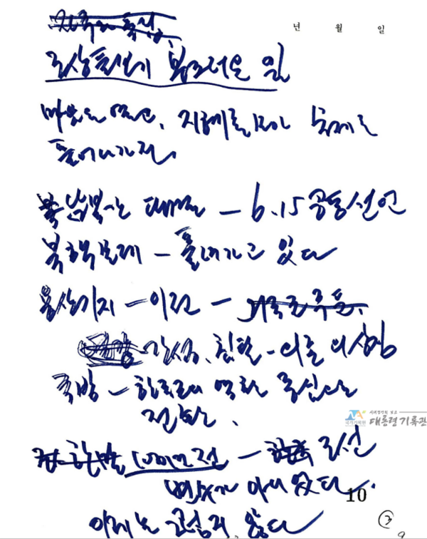 <시민언론 민들레>는 노무현 대통령 서거 14주기를 앞두고 노 대통령의 친필 메모를 통해 외교·안보 분야에 관한 그의 철학과 생각을 되돌아봅니다. 이 친필 메모는 노 대통령이 정상회담이나 외교·안보 관련 행사에 참석해 직접 작성한 것으로, 대통령기록관에 보관 중인 것을 노무현재단 사료편찬특별위원회가 이관받은 대통령 공개기록물입니다.