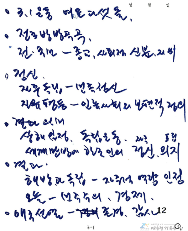 (2)를 보면, 3.1운동의 정신, 의미, 결과와 함께 ‘부끄러움과 아쉬움’‘우리 스스를 돌아보고’‘할 수 있다, 자신을 가지자’ 등의 단어가 뚜렷이 눈에 들어옵니다. 특히 ‘민주주의, 경제-지난 50년간 업적, 남북간 대결, 북핵문제-주도적 관여, 용산기지-간섭과 침탈, 국방과 안보-한국군의 역할 증대, 100년 우리는 변수가 아니었다, 이제는 중요 변수가 되어, 자신감을 가지고 나가자, 친미 반미 한발한발 자주독립, 동맹협력’ 등의 글에서 노 대통령의 확고한 외교·안보 분야 소신과 자신감이 보입니다.