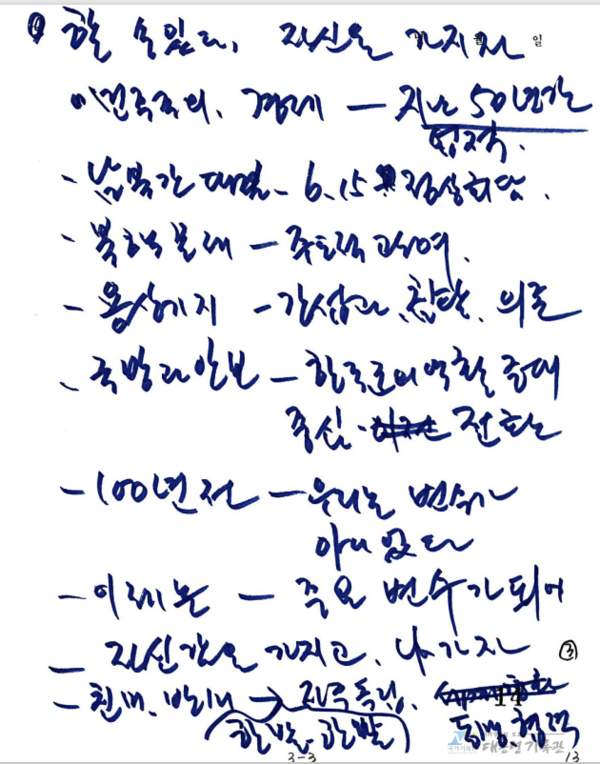 2004년 제85주년 삼일절 기념사 원고 역할을 한 친필 메모입니다. 노 대통령은 당일 연설비서관이 써준 연설문 대신 직접 작성한 이 메모를 바탕으로 연설을 했다고 노무현 사료관은 설명합니다. 기념사(1)에는 줄을 그어 지운 부분이 많이 눈에 뜨이고 기념사(2)는 좀더 정리된 메모로 보입니다. (1)을 작성한 뒤 다시 (2)를 정리했는데 실제 현장의 연설은 (2)번 메모의 내용과 흐름과 거의 비슷했습니다.