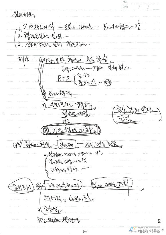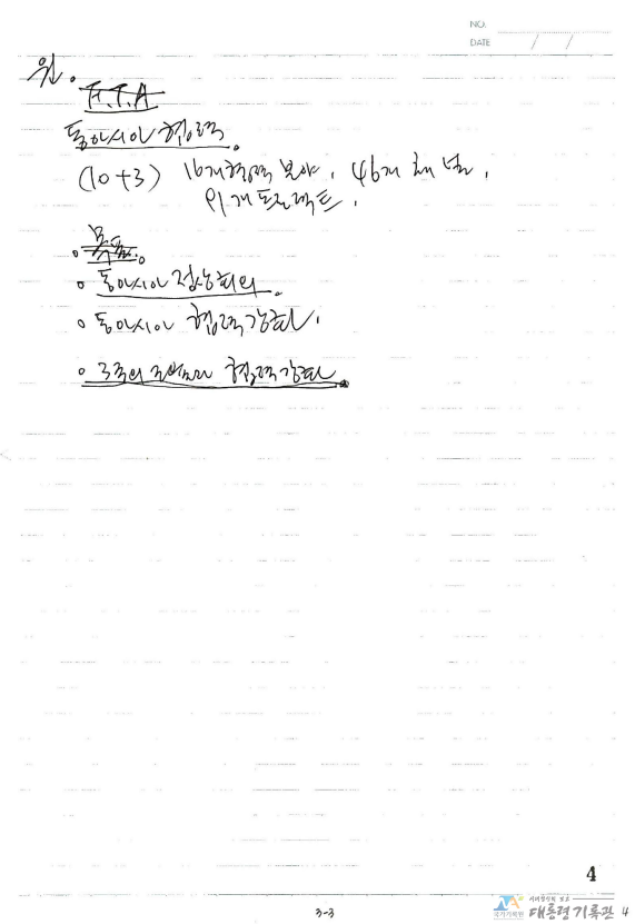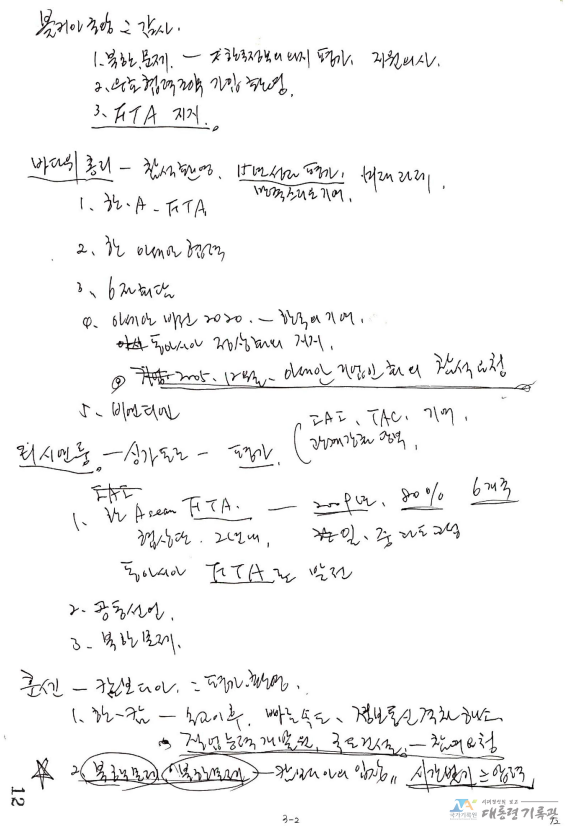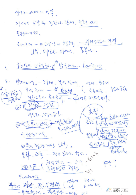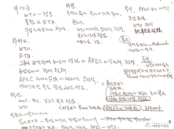 2004년 11월 칠레에서 열린 제2차 정상회의에서 남긴 메모입니다. 정상회의에 참석한 각국 대표의 발언을 메모한 것으로 보입니다. ‘WTO, FTA, 무역과 투자, 관세철폐’ 등 경제와 교역에 관한 단어로 빼곡합니다.