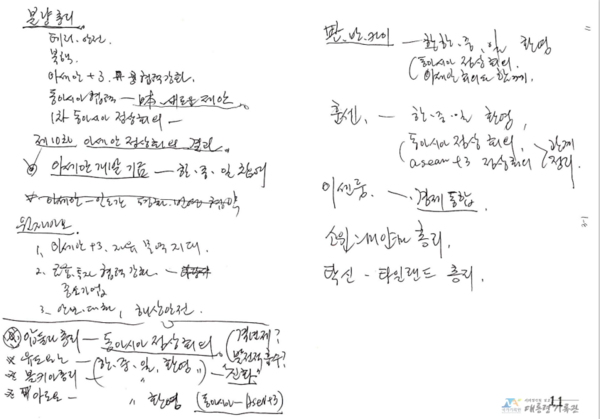 2004년 11월 라오스의 수도 비엔티엔에서 열린 제8회 아세안+3 정상회의 당시 노무현 대통령의 친필 메모입니다. ‘원자바오 중국 총리, 1. 지역책임의식 2.협력을 통한 윈윈 3. 상호의 강점을 살려 점진적으로, 제안 – 경제무역 협력의 수준향상’ ‘고이즈미- 3국 정상회의 역내 교환 개최, 에너지, 세관, 환율’ 등의 키워드가 눈에 뜨입니다. 중국, 미국과의 경제협력을 강조하는 내용입니다.