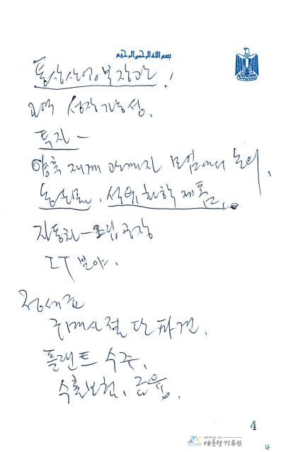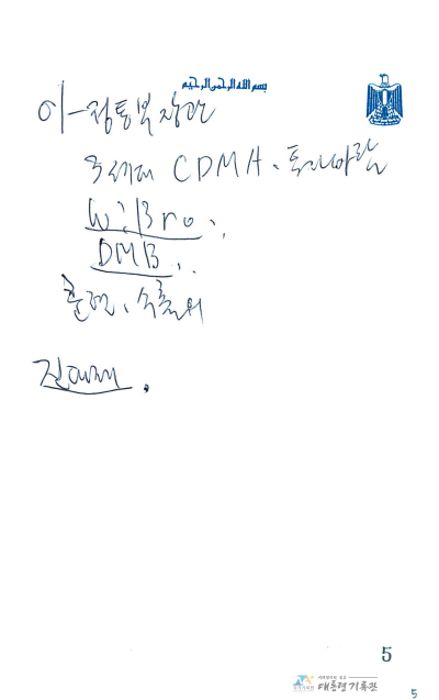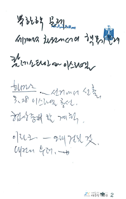 2006년 3월 노 대통령이 이집트 국빈방문 중에 무바라크 대통령과 가진 정상회담 메모입니다. ‘하마스, 이스라엘 총선, 이라크 –오래 걸릴 것, 내전 우려’ 등 중동지역 정세에 관한 메모와 함께 ‘교역 성장 가능성, 투자- 양측 재계 관계자 모임에서 논의, 자동차 조립공장, IT분야’ 등 경제 관련 용어들이 주로 나타나 있습니다. 한·이집트 정상회담 결과 정보통신(IT)과 문화·관광, 방위산업 분야에서 협력을 강화하기로 합의했습니다.