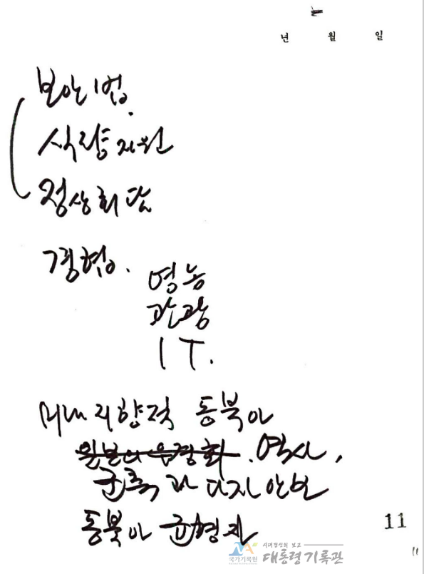2005년 7월 청와대에서 열린 민주평화통일자문회의 제12차 전체회의를 주재한 노무현 대통령이 남긴 메모로, 전체회의 중에 나온 주요 키워드를 적은 것으로 보인다고 노무현 사료관은 설명하고 있습니다. '보안법, 식량자원, 정상회담', '미래지향적 동북아 역사, 군축과 다자안보, 동북아 균형자' 등의 메모가 적혀있습니다.