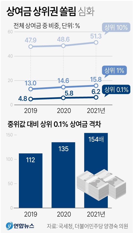 전체 상여 가운데 상위 0.1%가 받은 상여금의 비중은 2019년 4.8%에서 2020년 5.8%, 2021년 6.2%로 상승했다.