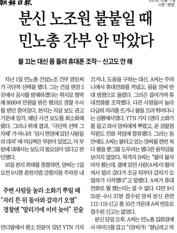 건설노조도 움직인다. 건설노조 100인 변호인단은 조선일보 기사와 관련해 명예훼손 고소, 기사 삭제, 정정 보도 청구 등을 진행할 예정이다. 유족과 건설노조 동료에게 왜곡 보도를 통해 정신적 고통을 줬다며 손해배상 등의 책임도 묻는다. 삶이 계속되는 한 약자는 싸움을 멈출 수 없다.
