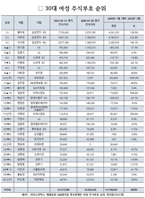 19일 기업분석연구소 리더스인덱스가 국내 기업 오너 일가 중 여성 주식부호 상위 30명의 주식평가액을 조사한 결과, 이달 12일 종가 기준 이들이 보유한 주식평가액은 23조 7173억 원으로 집계됐다.