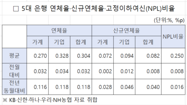 4월 5대은행 연체율 0.304%…1년새 0.118%p 올라