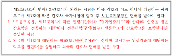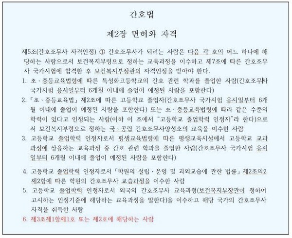 하지만 조 장관과 여권의 주장은 사실이 아니다. 간호법 제5조를 보면 제1~5항에 간호조무사의 응시 자격을 ‘특성화고 간호 관련 학과 졸업자’와 ‘고등학교 졸업자로서 간호조무사양성소 교육 이수자’ 등으로 규정한다. 여기에 추가로 제6항에 ‘제3조 제1항 제1호 또는 제2호’에 해당하는 ‘간호학을 전공하는 대학이나 전문대학을 졸업한 사람’과 ‘외국에서 대학이나 전문대학을 졸업하고 외국의 간호사 면허를 받은 사람’을 포함한다. 학력 조항은 의료법 80조를 그대로 가져왔다. 결론적으로 대졸자도 간호조무사가 되는 데 제한이 없다.